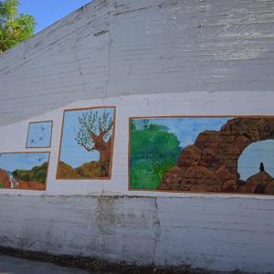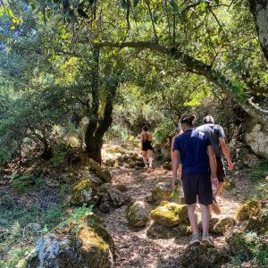 The painting is located at the beginning of the Karamanos hiking trail, which carries a great significance for the history of the village: During the Second World War, the people of Kryoneri collectively helped hiding a Jewish family of seven people to keep them safe from persecution. Whenever the Germans attacked the village, the family was brought to safety in a cave outside of Kryoneri. This cave is where the hiking path leads to, now creatively decorated with a painting that expresses the meaning behind it.